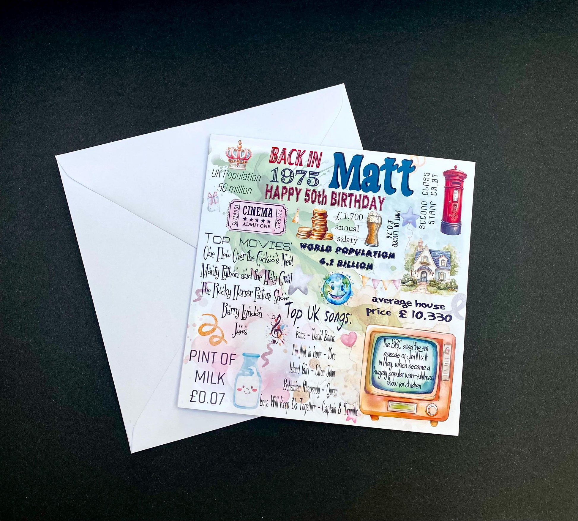 This personalised 1975 card is more than just paper - it's a trip down memory lane filled with fun, nostalgia, and ''Wow, I did not know that!'' moments.